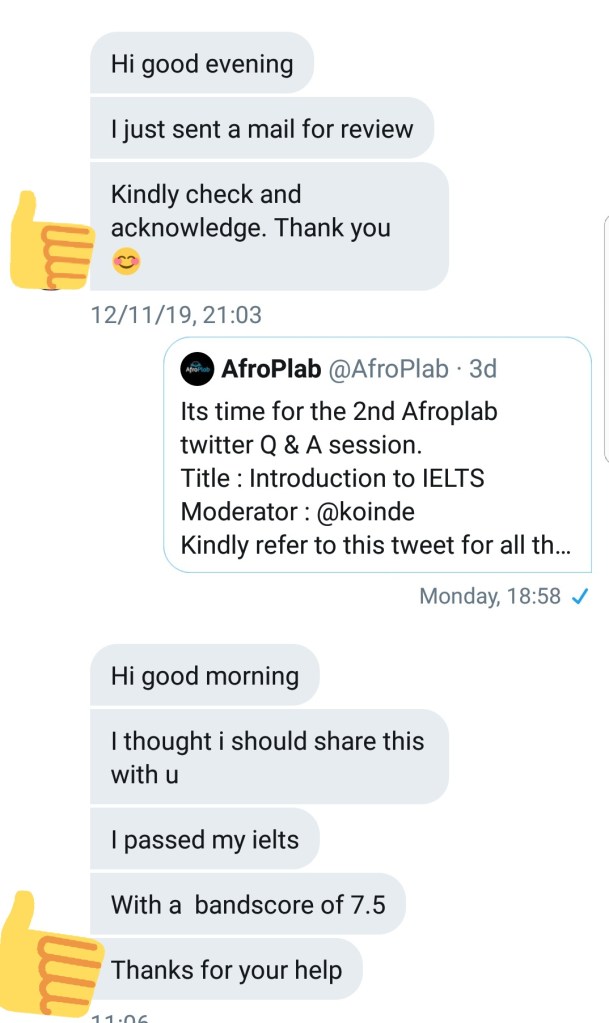 We set up our IELTS writing review service to help people understand the basic art of writing at a cheap rate and this person took advantage of the opportunity 🇳🇬 and passed her IELTS exam in one sitting.